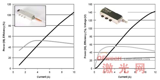 對于使用高亮度激光器系統來說,nLight 公司正在研發100µm發射源孔隙, 9xx nm的單一發射源二極管激光器,10W 976nm。這些設備有一個最高效率超過65%,有98%的極化純度偏振耦合效率,操作在10W功率以60%的效率。nLight公司的每個設備是很難焊接到相匹配的submounts和個別地被高功率篩選,加速老化高功率測試,嚴格的視覺檢測。典型的LIV曲線顯示在圖1中。