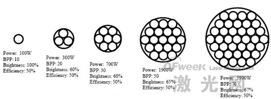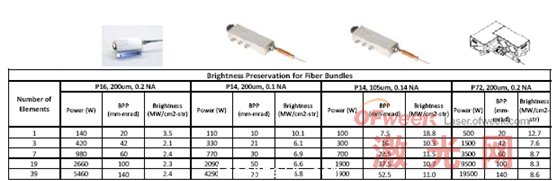 圖8 根據功率現有的產品空間,BBP和亮度對光纖包捆激光模塊。選擇光束資源的靈活性和光纖數量包捆提供了高靈活性光纖耦合激光模塊。廣泛的產品都可以用這個方法解決。