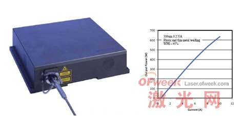 圖5.(左)一個單一發射源系統圖片。該裝置采用了單偏振輸出功率超過500W,300µm,0.2 NA 的光纖。(右)模塊的光與電流曲線。