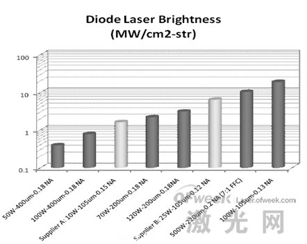 圖2.二極管激光器亮度(MW/cm2-str)為各種各樣的二極管激光器模塊。亮度超過18MW / cm2-str已經達到了使用nLIGHT的PearlTM生產線的水平。