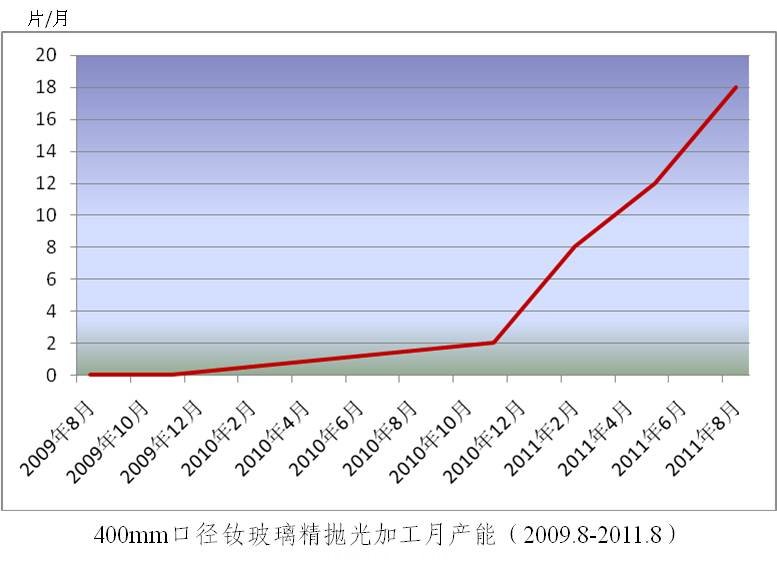 近年來,釹玻璃片精拋光過程中的面形控制工藝難度和表面疵病嚴重超標的現象一直制約著上海光機所恒益公司的加工產能。近幾個月來,上海光機所恒益公司集中組織專業技術人員,對釹玻璃光學加工中的相關工藝逐一進行分解和細化,圍繞確定性環形拋光技術和生產過程控制,以工藝改進和效率提升為目標,從技術路線和管理路線兩個方面進行攻關研究。目前,生產效能和加工工藝水平都取得重要進展,集中表現為以下兩個方面:產能得到有效提升,7個月內,月產能從2片/月提升到現在的15片/月(見附圖);產品技術指標提升,尤其是表面質量得到有效控制和改進,供貨合格率得到大幅提高。