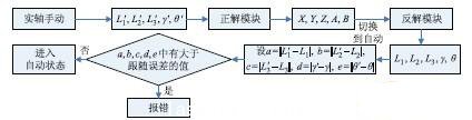 為了解決反解多解問題,在反解模塊中引入變量來讀取實(shí)軸實(shí)時(shí)坐標(biāo)(),將其與反解計(jì)算值() 進(jìn)行比較,取最接近實(shí)軸實(shí)時(shí)坐標(biāo)的那組解作為輸出,經(jīng)過處理后驅(qū)動(dòng)實(shí)軸運(yùn)動(dòng).為了節(jié)省運(yùn)算時(shí)間,此判斷過程只在實(shí)軸單軸手動(dòng)切換到自動(dòng)狀態(tài)時(shí)生效,判斷過后一直采用選中的那組解的解析表達(dá)式計(jì)算實(shí)軸坐標(biāo),直到下次切換.