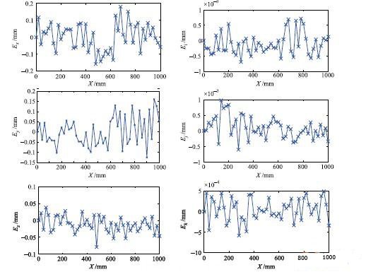 使用便攜式三坐標測量機對并聯(lián)機器人末端精度進行檢測.并聯(lián)機器人末端由(0;400;0;0;0) 沿直線運動到(1000;400;0;0;0),測出誤差如圖6 所示(圖中橫坐標為X 軸位置坐標,縱坐標依次為X、Y 、Z軸位置誤差和單位激光光軸矢量在X軸的投影I、在Y 軸的投影J、在Z 軸的投影K 的差).