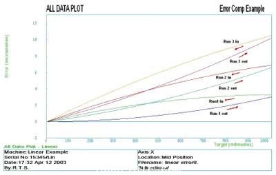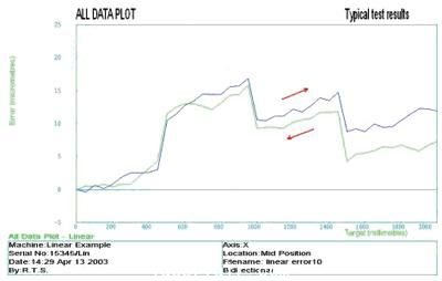 為保證測(cè)試的精確度,建議在開(kāi)始校準(zhǔn)之前要讓機(jī)床完全預(yù)熱。在圖3中,安裝滾珠絲杠的端部可能正好與行程起始點(diǎn)重合,并且可在另一端產(chǎn)生軸向浮動(dòng)。假如滾珠絲杠在對(duì)端受到限制,圖形將顯示負(fù)坡度。