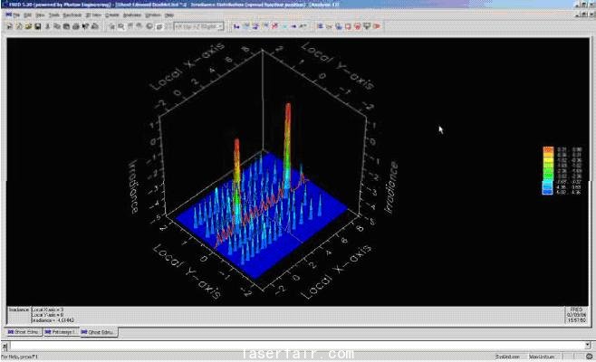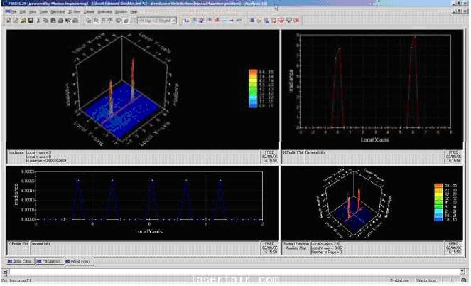 FRED 以四色的面板呈現輻照度圖。左上方是一個等大的偽彩色圖,它顯示的是在選中分析面上單元功率。 右邊的刻度顯示的是這個圖中的功率等級。 右上和左下的面板是左上面板的橫截面。點擊左上方圖中的任一處,一個橫截面將會出現在水平以及垂直兩個方向,在這個位置的坐標和輻射將會顯示在這個左上方的面板的左下角。右下方的圖顯示在這個分析面上定義的各個像素的數量和光線。如果用戶點擊右下方的圖,就可以看到每個探測器像素的相對誤差。這是一個很好的方式讓你知道是否已經追跡了足夠多的光線來為系統繪制有效的輻照度圖, 這點對于照明系統來說尤其重要。兩個雙膠合透鏡系統的輻照圖在下圖9中顯示。