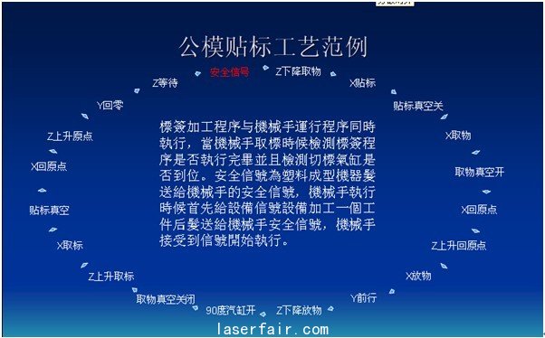工藝流程是:第一步,機械手將標簽貼在模具上;第二步,將成型設備加工好的盆(桶)從設備模腔中取出,放在修邊位置進行多于部分的修邊處理。第三步,等修邊處理完畢,將產品放在成品堆放處;第四步,在切標機上,機械手取出下一個標簽返回等待下一個模具。四個步驟循環執行。
