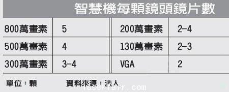 市場統計,去年大立光與玉晶光兩家全球市占率28.5%,若加計新鉅科、今國光、亞光、先進光等光學六雄砸重金擴產后,今年臺灣光學鏡頭業在全球市占率估達40%,成為臺灣之光。由于iPhone點火,引爆全球鏡頭的需求,近幾年在智能手機及低價計算機熱賣下,帶動照相手機鏡頭及筆記型計算機(NB)模塊出貨大幅成長,隨著手機照相功能成為必備功能,3G手機、高階智能手機對內建相機質量逐漸提高,手機相機主流規格今年躍升至500萬畫素,照相手機成為驅動光學元件廠業績爆發的最大動能。