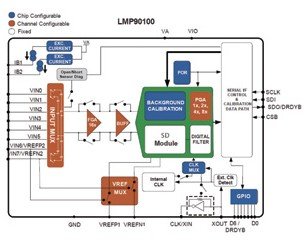 LMP90100提供了一個高度集成的8通道輸入多路復用器的組合,是一個帶有可調增益系數和24位Σ-Δ ADC的高精度放大器。器件包括電流源、電壓基準和其他功能。圖1顯示了該集成電路的內部結構:用戶可以根據傳感器和測量任務匹配圖中的所有彩色塊。