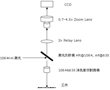 激光1064nm通過兩面拋光的反射鏡折射到下部,經(jīng)過聚焦作用在工件上。可見光通過反射鏡透射到上部,經(jīng)過relay透鏡將工件聚焦,經(jīng)過一個(gè)CCD的可調(diào)物鏡將工件成像在CCD的焦面上。