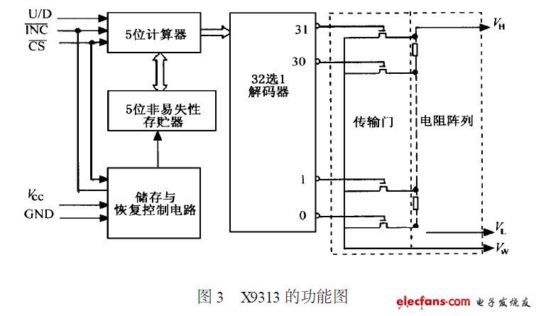 選用X9313非易失性數控電位器作為PWM芯片比較基準電壓的可控器件,功耗低,使用方便,可靠性好。X9313是一個包含31個電阻單元的電阻陣列,在每個單元之間的端點都有供滑動單元訪問的抽頭點。滑動單元的位置由CS.U/D和INC三個輸入端控制,滑動端的位置貯存在一個非易失性存貯器中,在下次上電工作時可重新調用,其功能如圖3所示。