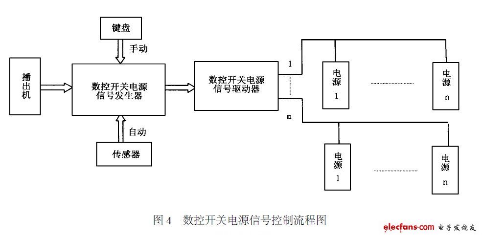 由播出機通過串行接口發出指令,送至信號發生器,經處理后產生控制信號,由驅動器放大,并送至各數控開關電源,輸出不同的電壓送至LED顯示屏。
