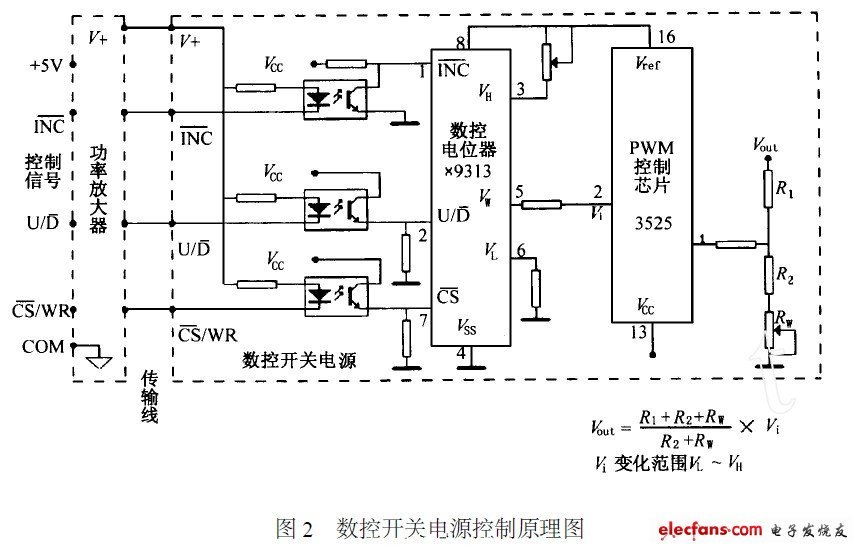 開關電源的輸出電壓范圍由VL、VH決定。從圖2輸出電壓的計算公式可以看出,只要保證VL、VH的一致性,就能保證電源輸出電壓的一致性。假設電壓調節范圍為4.5V~5.2V,那么輸出電壓偏差為±20mV,完全能滿足LED的供電要求。為了提高抗干擾性能,對進入開關電源的數字信號進行光電隔離。