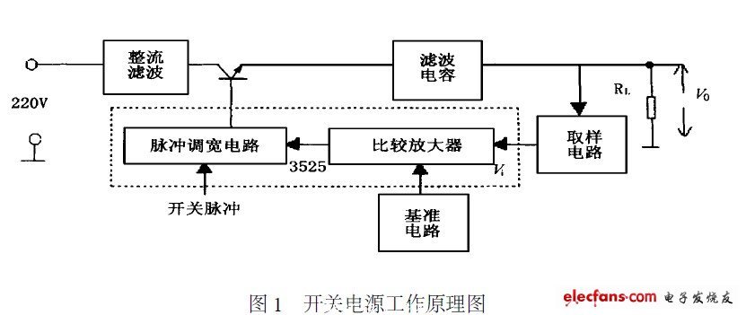 通用開關電源的工作原理如圖1所示。采用3525脈寬調制式(PWM)組件作為開關電源的控制電路,功能完整,應用方便。誤差放大器將電源輸出端的誤差信號放大后,經取樣電路送到比較器的反向輸入端,與來自基準電路中振蕩器輸出的斜波電壓比較。用比較器輸出的方波脈沖來控制3525內部輸出功率管的占空比。通過改變基準電壓及輸出取樣電路可以取得不同的電壓值。