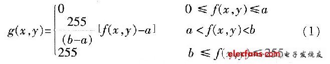 f(x,y)和g(x,y)分別表示輸入圖像和輸出圖像的灰度值。經過變換,線性拉伸了在a~b內的灰度值,同時對[0,a]和[b,255]灰度區間進行抑制。從顯示設備的角度來說,一般民用級別的顯示器都不具備完美表現256灰階的能力,因此抑制過暗[0,a]和過亮[b,255]的灰度區間而增強中間區域的動態范圍,可以避免灰階的浪費。從另一個角度來講,通常一幅圖像所包含的過暗和過亮的像素點本來就是少數,有目的有針對性地擴展中間范圍灰度而壓縮兩頭的灰度,可增強圖像質量,得到更好視覺效果,而圖像信息的損失卻很小。