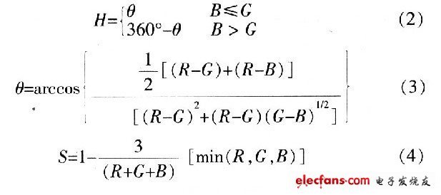 由圖2看出,三原色是按120°分割的,青、品紅和黃被稱為二次色,也是按120°分割,一次色與二次色之間相隔60°。圖中任給出一點Q,若以紅軸作參考,則Q向量與紅軸的夾角H決定其色調,而向量長度S決定其飽和度,整個平面在灰度軸上的位置決定了平面內所有點的亮度I。于是得到由RGB到HSI的轉換關系: