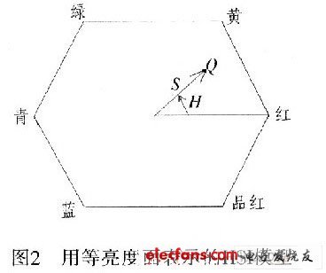 實際上,用垂直于灰度軸的平面內的彩色點軌跡來表示HSI空間(等亮度面)。當平面沿灰度軸上下移動時,由于立方體邊界的切割而構成的橫截面所決定的邊界呈三角形或呈六邊形。這里以六邊形為例,如圖2所示。