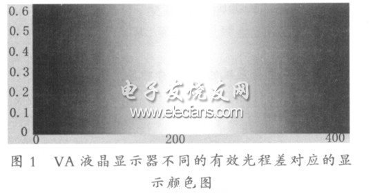 給VA 液晶顯示器從零開始加驅動電壓,由上面的顯示原理可知,在某個驅動電壓下,有效光程差達到300nm 時,顯示亮度將達到最大值。當驅動電壓加到足夠大時,液晶分子由垂直狀態完全旋轉成平行狀態,對于某一固定光程差的VA 液晶顯示器,此時高壓狀態所對應的顯示亮度與最大值顯示亮度的比值是一定的。因此,通過測試已知不同光程差的VA 液晶顯示器,可得出所對應的不同顯示亮度的比值,整理成圖表,為以后未知光程差產品的測試提供準確的判斷依據。