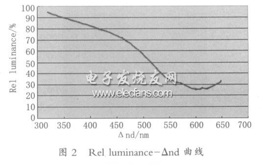 采用本試驗總結出的以上Rel luminance- Δnd曲線,對于某一未知光程差的VA 液晶顯示器,只需簡單測試出高壓光電曲線,得出高壓顯示亮度與最大值顯示亮度的比值,然后對照圖2 所示的曲線,就可準確得出相應的光程差值。