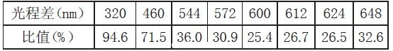 由圖1 可總結出,在有效光程差較小時,可見光的各波長比較聚集,顏色只有黑白兩色。在有效光程差300nm 附近出現一亮態極大值,之后隨著有效光程差的增大,不同波長的相位差差別越大,其亮態峰值將越來越小。