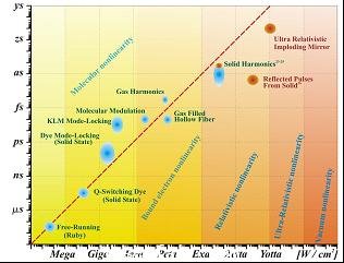 隨著激光技術飛速發展,超快激光出現了人們的視線之中,它具備獨特的超短脈沖、超強特性,能以較低的脈沖能量獲得極高的峰值光強。超短脈沖啁啾放大技術(Chirped Pulse Amplification,CPA)的出現使超快激光的強度得到大大提高。與傳統長脈沖激光及連續激光不同,超快激光有著超短的激光脈沖,這使得激光脈沖的頻譜寬度相當大。這樣寬的頻譜在進行諸如原子能級研究,激光選鍵化學等方面都具有重要的應用。利用超快激光脈沖短的特點,可以采用泵浦-探測的方式,將激光脈沖與物質相互作用現象在不同的時刻照相,以期獲得整個過程的特點。這個方法已經被應用到各個領域,如在原子與分子反應動力學研究中以及觀察電子的運動,利用飛秒激光脈沖甚至阿秒脈沖,通過泵浦-探測的方法觀察到反應過程。聚焦后的超快激光,其峰值功率密度超過1013W/cm2時,所產生的電場強度就已經大于原子的內電場。它提供的極強極高的電場,能夠超過價帶電子的束縛力,使分子、原子的電子體系發生巨大變化。利用這個特性,人們可以研究由于超快激光導致原子內部產生的奇特現象。并且,超快激光還顯示出其它不同的特性,如熱影響區域小、作用效果能夠超過光學衍射極限、優秀的空間選擇特性。下圖展示了超快超強激光的發展過程與應用范圍。