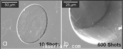 圖2. 鉆石經(jīng)193nm準分子激光燒蝕形成的凹坑:左圖為10個激光脈沖情況,右圖為600個激光脈沖情況。凹坑的平整度表明了準分子激光光束在整個照明區(qū)域具有極高的均勻性。