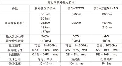 表1概括比較了準分子激光器技術和紅外上轉換激光器技術的典型紫外性能參數(shù)。