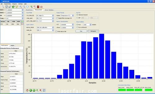 如果系統設計師有興趣深入研究傳感器模擬前端電路的性能,他們可以購買與軟件配套的開發硬件。利用SPIO-4基于USB的數據采集板,所有配置均可輕松地在幾秒內傳到傳感器模擬前端電路評估板上。只要使用合適的開發硬件,系統設計師即可轉入測量選項卡,此時,他們可以對比實際測量的數據和估計的數據值。由于一些傳感器模擬前端電路如LMP90100具有多路輸入,可以同時監測數個傳感器。系統設計師也可以監測電壓、模數轉換器輸出情況或傳感器專用性能指標(如溫度傳感器的攝氏或華氏溫度)等系統性能,利用傳感器數據庫中的數據,該開發工具為用戶帶來這一功能。此外,其統計數據也可以涵蓋被收集的數據,所有數據可以采用模擬示波器截屏的時間域或柱狀圖的形式顯示。開發工具是傳感器模擬前端電路幫助系統設計師輕松完成其硬件開發而提供的另一選擇。