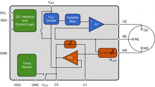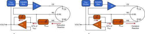 相對傳統設計,另一個傳感器模擬前端電路可以發揮巨大優勢的多傳感系統應用是在需要用同一儀器設計感應多種不同氣體的有毒氣體檢測器時。有些有毒氣體傳感器在特定氣體中會發生氧化反應,而其它傳感器可能發生還原反應。傳統的解決方案要求能夠調節用于測量流經傳感器的電流的跨導放大器(TIA)的偏置電壓。對于電流流出傳感器工作電極(WE)時的還原反應,偏置電壓需要設定為正參考值,以防止電流變大時TIA的輸出在近地附近限幅。氧化反應下,電流會流入傳感器的工作電極,為此偏置電壓需要設定在地附近,以防止TIA的輸出在正電源附近飽和。這可以通過幾種定制的分立式設計方式實現,一種方案是采用雙極性電源,它在地附近為TIA的輸入加設偏置電壓,使其可以在任一方向上變化。另一種方案是針對特定類型的有毒氣體傳感器,利用外部數模轉換器(DAC)或模擬開關改變從地附近到正電源電壓附近的偏置電壓。此外,還有一種備選方案是采用LMP91000,它針對TIA輸入集成了可編程偏置電壓,該方法可以以單一正電源電壓為兩類化學反應正常供電。有毒氣體檢測器的另一個設計挑戰是需要檢測電流的動態范圍。一些有毒氣體傳感器的滿量程范圍為600 uA、靈敏度為10nA/ppm,而其他的傳感器滿量程范圍可能為10 uA、靈敏度為1 nA/ppm。解決這一問題同樣有多種解決方案。為了在寬電流范圍內提供足夠的測量分辨率,相對于傳統的12位模數轉換器,定制方案需要16或24位高分辨率模數轉換器,它雖然在整個電流范圍內確保了所需的分辨率,但數模轉換器的成本大幅提高。另一個選擇是利用模擬開關切換不同的反饋電阻值,以改變TIA的增益,這樣就能使用12位模數轉換器并更好地利用模數轉換器的動態范圍獲得所需的性能。LMP91000內置從2kΩ 到375kΩ的可編程反饋電阻和可切換到外部反饋電阻的性能選項從而解決了這一難題。最后,有些應用還要求控制有毒氣體傳感器工作電極(WE)與參考電極(RE)之間的電勢差,有些傳感器如一氧化碳傳感器需要零偏置電壓,即要求RE和WE在相同的電位上。而,有些氣體傳感器如一氧化氮傳感器需要正偏置電壓,另外一些傳感器則需要負偏置電壓,定制設計可以通過綜合利用模擬開關、多種參考電壓和/或模數轉換器而實現。LMP91000通過提供從+24%的VREF到-24%的VREF的可編程偏置電壓得以解決這一問題。
