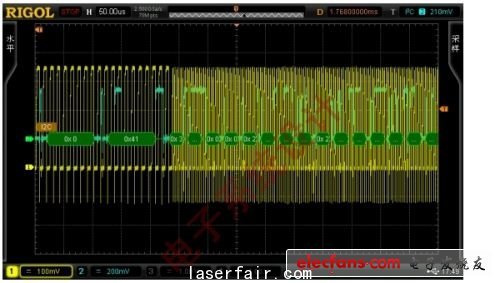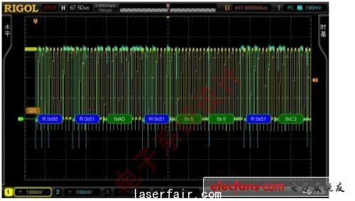 同樣,在下載固件時可以通過使用DS6104來監(jiān)測I2C的通信數(shù)據(jù),并且可以明顯看到時鐘頻率的變化,如圖8所示。