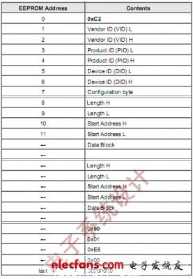 我們按照圖7所示的Cypress文檔提供的寄存器配置格式,配置固件為啟動時斷開USB連接,并將I2C時鐘設置為400KHz(將地址7數(shù)據(jù)修改為“0x41”)。