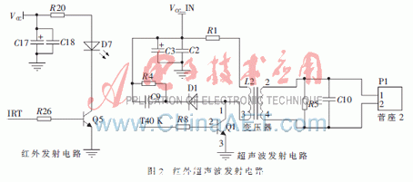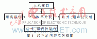 超聲波作為一種特殊的聲波,由于其指向性強,在空氣中傳播速度相比光速要小很多,其傳播時間容易檢測,因此,目前超聲波測距中廣泛采用回波-渡越時間方法[1],即檢測從超聲波發射器發出的超聲波,經氣體介質傳播到接收器的時間即為渡越時間。渡越時間與氣體中的聲速相乘,就是聲波傳輸的距離。該測試方法對于超聲波探頭的要求相對比較高,不適合做長距離測量。本文設計的超聲波測距儀主要用于長度超過10 m的遠距離測量,而且要求可靠性高、穩定性好。故本文采用紅外與超聲波相結合的設計方案以實現這一功能。