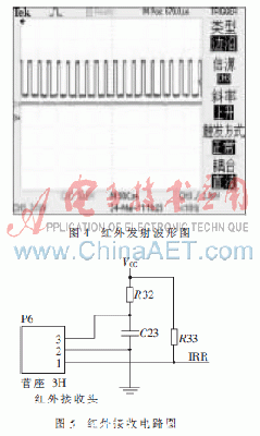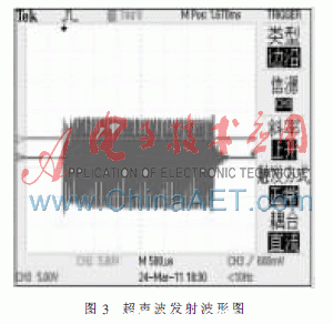 在超聲波測距系統中, 40 kHz的超聲波信號是最理想的信號,而紅外的最佳頻率為38 kHz。其硬件組成電路如圖2所示。在超聲波發射電路中,由R4、C9和D1構成D-R-C吸收電路來保證三極管Q1能夠穩定可靠地工作,而不會損壞。紅外的38 kHz和超聲波的40 kHz頻率的方波由STM8單片機的定時器產生。圖3為超聲波電路中L2和超聲波探頭P1以及C10共振的波形圖,衰減了10倍。圖4為紅外發射波形圖。