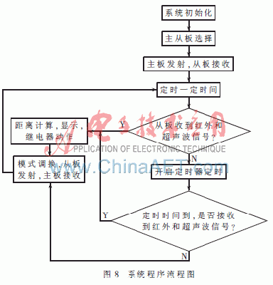 STM8單片機控制器主要完成紅外和超聲波的中斷響應、發射定時以及產生38 kHz和40 kHz的方波來驅動各自的三極管以及紅外與超聲波接收信號的濾波、數據處理、距離計算和實測距離的顯示。系統程序流程如圖8所示。