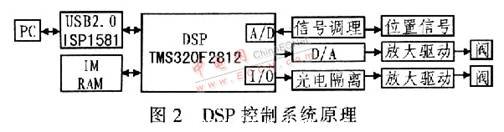 控制系統采用了PC+DSP的控制方案,系統總體結構如圖2所示。其中PC機主要用來顯示控制界面,調節各控制參數,實時顯示各相關信號。而DSP則完成低層的控制功能,通過A/D轉換器采集各路信號,經過一定的算法處理后,由D/A口輸出,以及通過I/0口、光電隔離驅動放大電路來控制各電磁閥的開關。同時通過通信,向PC機發送采集來的信號,并接收PC機的起動、停止等指令以及各控制參數。