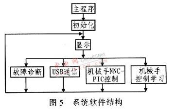 DSP的系統軟件設計是在CCS2000的開發系統下采用C語言設計和編寫,采用自頂向下的設計思路,按功能劃分軟件模塊,系統軟件如圖5所示,主要由初始化模塊、故障診斷、USB通信模塊、機械手NNC控制學習模塊和機械手NNC-PID控制模塊等組成。