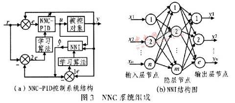 神經網絡PID控制系統結構如圖3(a)所示。從控制系統框圖中可以看出,神經網絡PID控制包括兩個控制子模塊:NNI為被控對象模型辨識器,NNC為神經網絡PID控制器。NNC-PID控制系統的工作原理是:首先獲取實際被控對象的輸入輸出樣本對,然后利用NNI對被控對象進行離線辨識,當辨識精度達到設定的要求時,通過實時調整NNC的權值系數,使系數具有自適應性,從而達到有效控制的目的。#p#分頁標題#e#