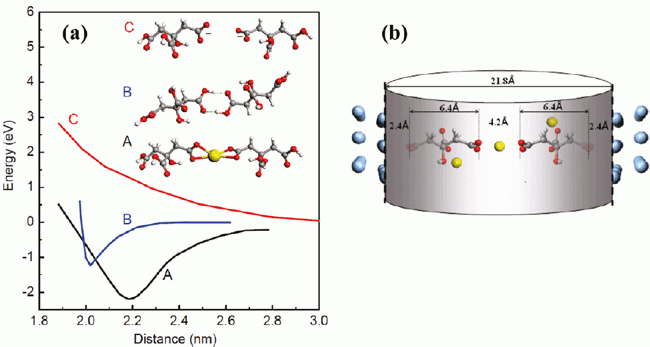 圖三:形成納米孔的分子水平微觀物理機制,左圖為能量極小值,右圖為分子大小與孔直徑關(guān)系。