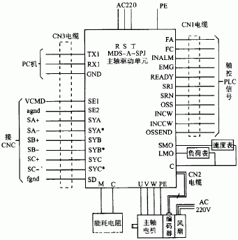 圖3為主軸驅(qū)動(dòng)系統(tǒng)的連接電路。MDS-A-SPJA系列主軸驅(qū)動(dòng)器上共有9個(gè)強(qiáng)電接線端子和3個(gè)信號(hào)電纜插座CN1,CN2,CN3。9個(gè)強(qiáng)電接線端子分別為:AC 220V三相電源進(jìn)線R,S,T,交-直-交變頻主回路的直流側(cè)能耗制動(dòng)電阻接線端子C,P,向主軸電機(jī)供電的變頻輸出動(dòng)力線端子U,V,W及屏蔽線接線端子PE。信號(hào)電纜CN3用于連接CNC系統(tǒng)及PC機(jī),其中SE1,SE2用來(lái)接受數(shù)控系統(tǒng)的模擬電壓指令(±10V),SYA,SYA,SYB,SYB3,SYC與SYC3是從主軸驅(qū)動(dòng)單元送回CNC的當(dāng)前速度反饋信號(hào)線(6根分為A,B兩相各2根,零脈沖Z相2根),TX1,RX1,GND則分別為串行發(fā)送、接收信號(hào)線及地線,用于連接PC機(jī)的串行口,作主軸驅(qū)動(dòng)單元的運(yùn)行參數(shù)、準(zhǔn)停參數(shù)預(yù)設(shè)定及主軸狀態(tài)監(jiān)控,正常運(yùn)行時(shí)不必連接。CN2是三菱公司提供的標(biāo)準(zhǔn)電纜,用來(lái)傳遞主軸編碼器對(duì)主軸驅(qū)動(dòng)單元的速度/位置反饋信號(hào)。CN1電纜有40線之多,主要作為主軸的軸控PLC信號(hào),被連接于數(shù)控系統(tǒng)PMC的I/O點(diǎn),以完成CNC對(duì)主軸的狀態(tài)監(jiān)控及動(dòng)作控制。CN1中有代表性的信號(hào)為:FA,F(xiàn)C,OSSEND,INCW,INCCW,INALM由主軸驅(qū)動(dòng)器發(fā)向數(shù)控系統(tǒng)的PMC,傳遞主軸驅(qū)動(dòng)器的當(dāng)前狀態(tài),即FA與FC接通表示主軸報(bào)警,OSSEND指示主軸準(zhǔn)停動(dòng)作已經(jīng)到位,INCW,INCCW,INALM則指示主軸處于正轉(zhuǎn)、反轉(zhuǎn)還是報(bào)警中;REDAY,SRI,SRN,OSS,EMG則由數(shù)控系統(tǒng)的PMC發(fā)向主軸驅(qū)動(dòng)器,傳遞CNC對(duì)主軸的控制命令,即REDAY為就緒信號(hào),SRI為正轉(zhuǎn)命令,SRN為反轉(zhuǎn)命令,OSS為準(zhǔn)停命令,EMG為緊急停止命令。CN1電纜上還有2根線SM0與LM0,可分別與地線G間接入主軸速度表和負(fù)載表,用于數(shù)控機(jī)床的面板顯示。