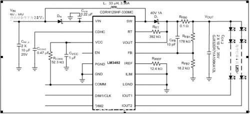 圖4示意了考慮到冷啟動情況下,汽車中使用的LCD面板背光普遍采用LED驅動器的電路,該電路使用了美國國家半導體的LM3492芯片。該電路驅動2個LED燈串,每個燈串都含有工作電流為100mA的6個LED。電路的標稱輸入電壓范圍為9V至16V,標稱開關頻率為300 kHz。該電路的基本組成元素包括一個升壓轉換器和一個雙通道線性穩流器。MOSFET開關集成在LM3492內,實現了更小的方案體積。LM3492的VIN針腳通過二極管連到輸入電壓,當電池電壓低于最低要求的4.5V時,芯片內部連接了VIN和VOUT引腳(后者連接升壓轉換器的輸出電壓)的電路就會為LM3492供電。這里選用了一個飽和電流為3.36A的33uH電感器,盡管對于正常輸入電壓而言,1A的飽和電流就已足夠。