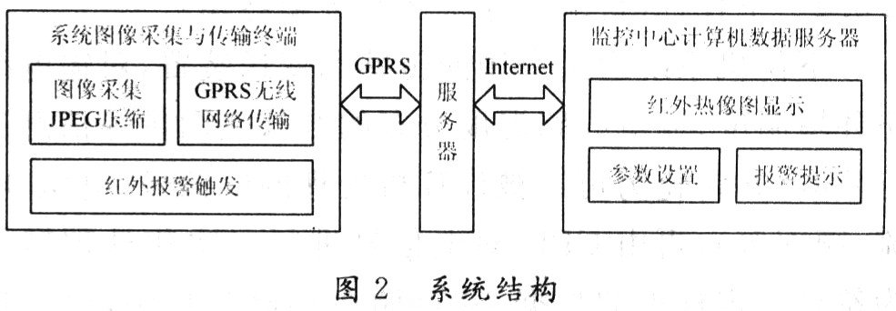 整個系統硬件結構主要分為前端和中心端。前端圖像采集與傳輸系統是基礎前提,其結構和性能直接決定了整個系統性能的好壞。前端硬件主要由五部分組成:主控制模塊、圖像采集模塊、圖像壓縮模塊、GPRS無線傳輸模塊以及紅外報警模塊。中心端即監控中心計算機數據服務器與前端硬件系統起著承上啟下的作用。其結構框圖如3所示。