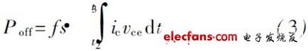 關晶體管在工作過程中的損耗分為開關損耗和穩態損耗, 其中開關損耗包括導通損耗和關斷損耗, 穩態損耗包括通態損耗和截止損耗, 其中截止損耗占總的損耗的比率很小, 可以忽略不計。我們把Vce由90% Vindc降到110% Vcesat所用的時間定義為導通延時, 即圖2中的t1 - t0, 把IC 由90% Icmax下降到0所用的時間定義為關斷延時, 即t3 - t2。