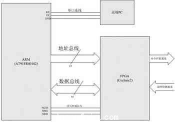 圖1為此系統(tǒng)的結(jié)構(gòu)連接框圖。如圖所示,ARM芯片與FPGA芯片之間通過(guò)數(shù)據(jù)總線(xiàn)、地址總線(xiàn)及讀寫(xiě)控制線(xiàn)相連,而與終端PC則通過(guò)串口通信;FPGA與目標(biāo)設(shè)備通過(guò)命令控制總線(xiàn)和故障檢測(cè)總線(xiàn)相連。