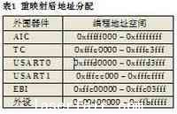 由于重映射主要是用于Flash和片內(nèi)RAM的地址空間交換,所以片內(nèi)外圍接口(EBI、USART、TC)對(duì)應(yīng)的存儲(chǔ)器編程地址范圍在映射前后不發(fā)生改變,而訪(fǎng)問(wèn)外設(shè)地址為重映射后所分配。重映射后地址分配如表1所示。