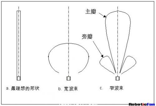 對于機(jī)器人的應(yīng)用來說,超聲波傳感器主要用來探測物體的距離以及相對于傳感器的方位,以便可以進(jìn)行避障動作。最理想就是矩形,不但可以準(zhǔn)確的獲得物體的距離值,也可以準(zhǔn)確的獲得方位值,就是正前方。但是實際上,超聲波的波束根據(jù)應(yīng)用不同,有寬波束,和窄波束。寬波束(圖1-b)的傳感器會檢測到任何在波束范圍的物體,它可以檢測到物體的距離,但是確無法檢測到物體的方位,誤差最高會有100度左右,機(jī)器人將無法準(zhǔn)確的確定其避障的動作。當(dāng)然,作為只要探測物體有或者無的用途來說,寬波束的傳感器是比較理想的。同理,窄波束可以相對寬波束獲得更加精確的方位角。在選擇超聲波傳感器的時候,這個波形特性是必須要考慮的。