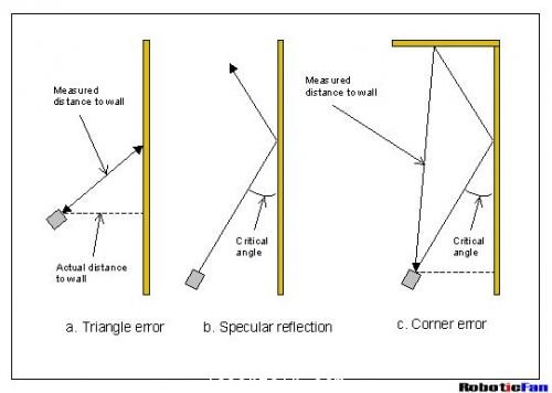 雖然多數(shù)超聲波傳感器的工作頻率為40-45Khz,遠(yuǎn)遠(yuǎn)高于人類能夠聽到的頻率。但是周圍環(huán)境也會產(chǎn)生類似頻率的噪音。比如,電機(jī)在轉(zhuǎn)動過程會產(chǎn)生一定的高頻,輪子在比較硬的地面上的摩擦所產(chǎn)生的高頻噪音,機(jī)器人本身的抖動,甚至當(dāng)有多個機(jī)器人的時候,其它機(jī)器人超聲波傳感器發(fā)出的聲波,這些都會引起傳感器接收到錯誤的信號。
