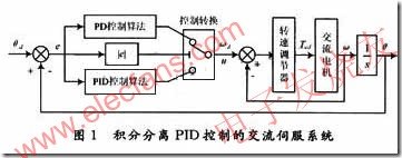 積分分離PID控制交流伺服系統結構如圖1所示。圖中θd為給定角位移,θ為電機轉軸的實際角位移,e為θd和θ進行比較而得到的偏差,則有: