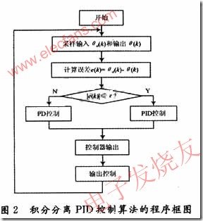 在PID控制中,積分環節的作用是消除靜態誤差,提高系統的控制精度。如果在誤差較大的初始階段引入積分環節,會造成:PID的積分累積,從而引起系統較大的超調。因此,本文針對PID控制的特點,設計了一種積分分離的控制方法,積分分離PID控制算法的程序框圖如圖2所示。