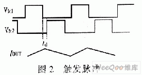 VM1關(guān)斷,電流通過(guò)VD續(xù)流,接著VN2導(dǎo)通。由于VM2的阻抗遠(yuǎn)小于二極管阻抗,因此通過(guò)VM2續(xù)流。VMl、VN2觸發(fā)脈沖如圖2所示。圖2中td為續(xù)流二極管導(dǎo)通時(shí)間。