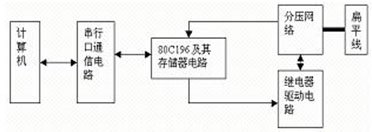 其中,主控電路包括:80c196擴(kuò)展電路,串行通信電路,分壓網(wǎng)絡(luò)和其它輔助電路。單片機(jī)通過串行通信接收計(jì)算機(jī)的命令然后進(jìn)行指定的操作:測量傳感器和傳送測量結(jié)果。主控電路結(jié)構(gòu)如圖3所示: