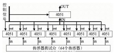 輔助電路結(jié)構(gòu)如圖4所示,包含開關(guān)網(wǎng)絡(luò),用于通道切換。由圖可知,每個4051邏輯開關(guān)有8個輸入端,一個輔助電路可以同時連接64個傳感器,故整個系統(tǒng)可一次性測量512個感器的參數(shù),大大提高了測量效率。